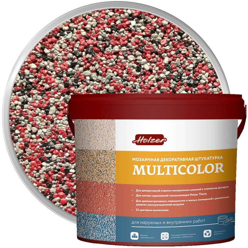 Хольцер Мультиколор Ф - мозаичная акриловая декоративная штукатурка, предназначенная для формирования тонкослойных покрытий с выразительной мозаичной фактурой. Продукт полностью готов к нанесению. В составе цветная мраморная и кварцевая крошка в разных сочетаниях. Разные сочетания, дают разные цвета и иллюзию натурального природного камня.