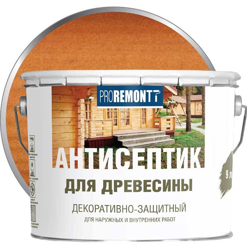 Антисептик PROREMONTT - лессирующий декоративный защитный состав, защищающий древесину от атмосферных явлений, солнца и грибков.
