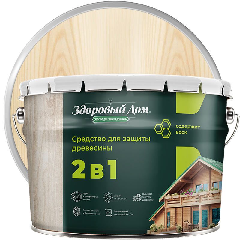 ЗДОРОВЫЙ ДОМ 2В1 – состав, который играет роль грунта-антисептика и защитно-декоративного покрытия. Защитит дерево от ультрафиолета, влаги, явлений погоды и грибков. От влаги защищает воск, масло придает эластичность и защищает от растрескивания. Выпускаются 10 готовых цветов. Срок защиты 8 лет.
