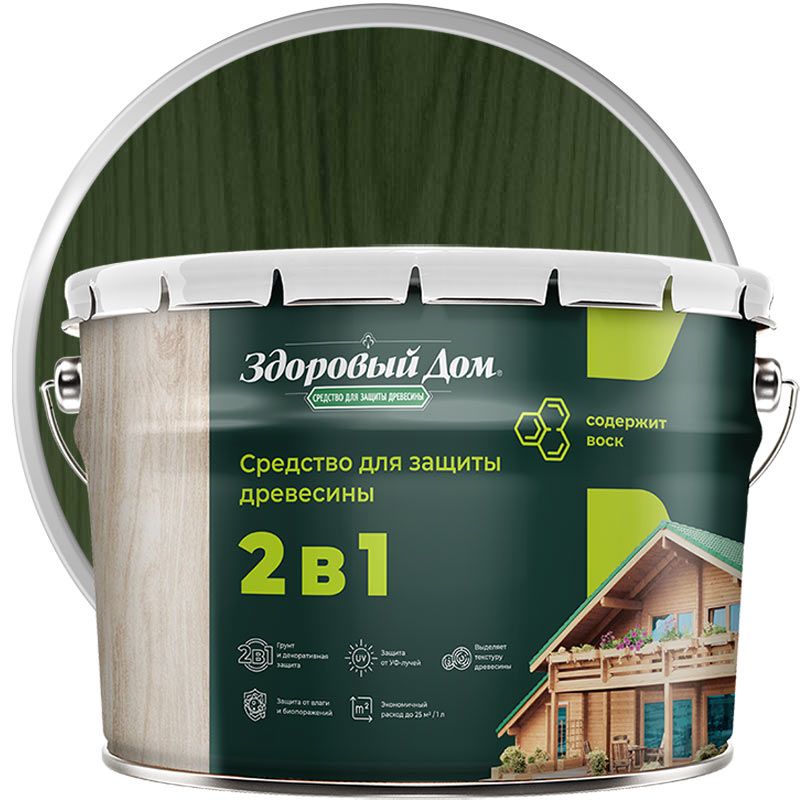 Антисептик лессирующий декоративный для дерева ЗДОРОВЫЙ ДОМ 2В1 Еловая зелень 10 л