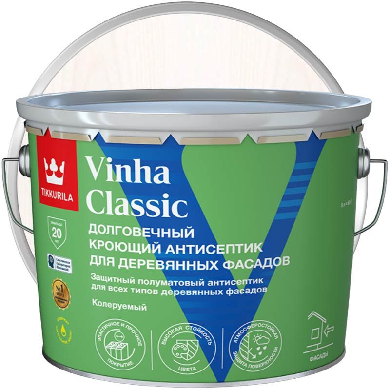 Tikkurila Vinha Classic – кроющий антисептик для деревянных конструкций, глубоко проникает в дерево. Защищает от непогоды, воды, света и грибков, продлевая срок службы конструкции.