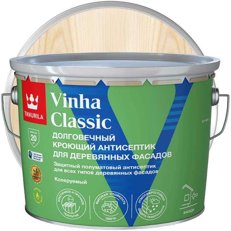 Tikkurila Vinha Classic – кроющий антисептик. Образует полуматовую поверхность с высокой стойкостью цвета. Благодаря маслу в составе, средство глубоко проникает в волокна древесины, защищая изнутри. Покрытие прочное и эластичное одновременно, не растрескивается и не отслаивается. Защищает от атмосферных явлений, от непогоды, от ветра и от вредного солнечного спектра. Подавляет рост грибка и плесени.