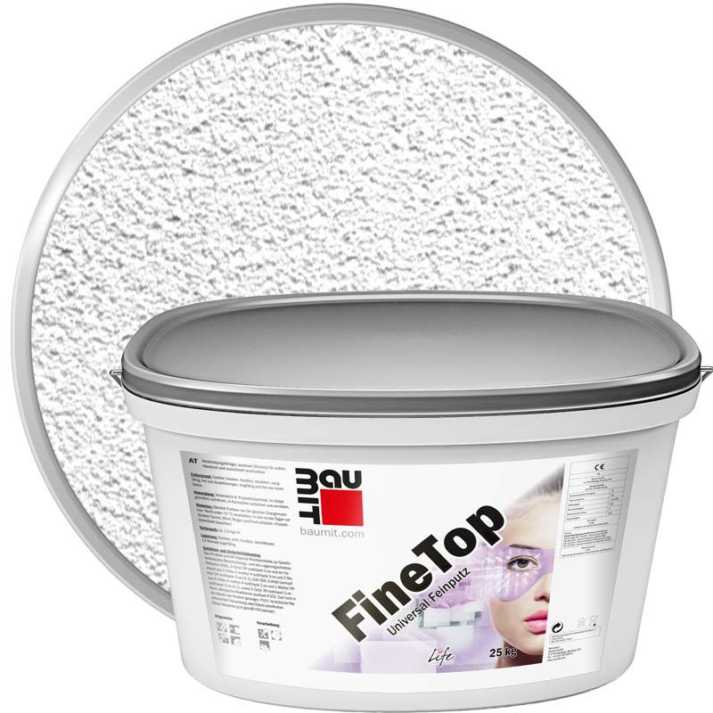 Баумит ФайнТоп - Универсальная декоративная мелкозернистая штукатурка. После нанесения штукатурка имеет фактруру «Шуба» - это мелкозернистая равномерная поверхность. Выпускается с использованием силиконовой смолы. Применение – внутреннее и наружное. Используется в системах СФТК, для проемов и декоративных элементов. Кроме этого, материал используется при проведении работ по санации.