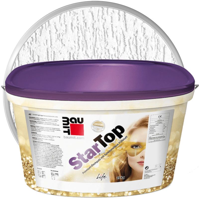Баумит СтарТоп – декоративная штукатурка премиум - класса. В составе функциональный наполнитель, который обеспечивает быстрое высыхание фасада, после дождей, туманов и конденсата. Итогом сухой поверхности является повышенная защита от появления грибка и т. п.