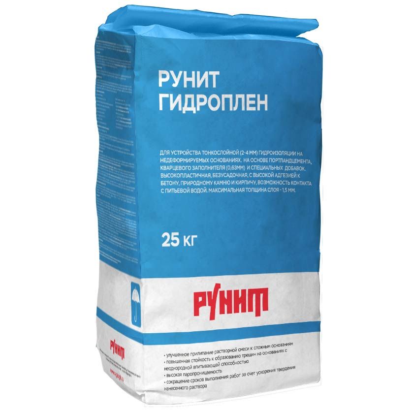 Гидроизоляция цементная РУНИТ Гидроплен — материал для устройства тонкослойной гидроизоляции на недеформируемых жестких основаниях. Состав имеет хорошую адгезию к бетону, кирпичу натуральному камню, не дает усадку, высоко пластичный. Сделан на основе портландцемента с наполнителями и функциональными добавками. Обеспечивает защиту от морской воды, грунтовых вод, агрессивной среды и газов; от карбонизации и антиобледенительных солей. Наносится на влажную поверхность в два слоя, с общей толщиной от 2-до 4 мм. Нанесение ручное или механизированное.