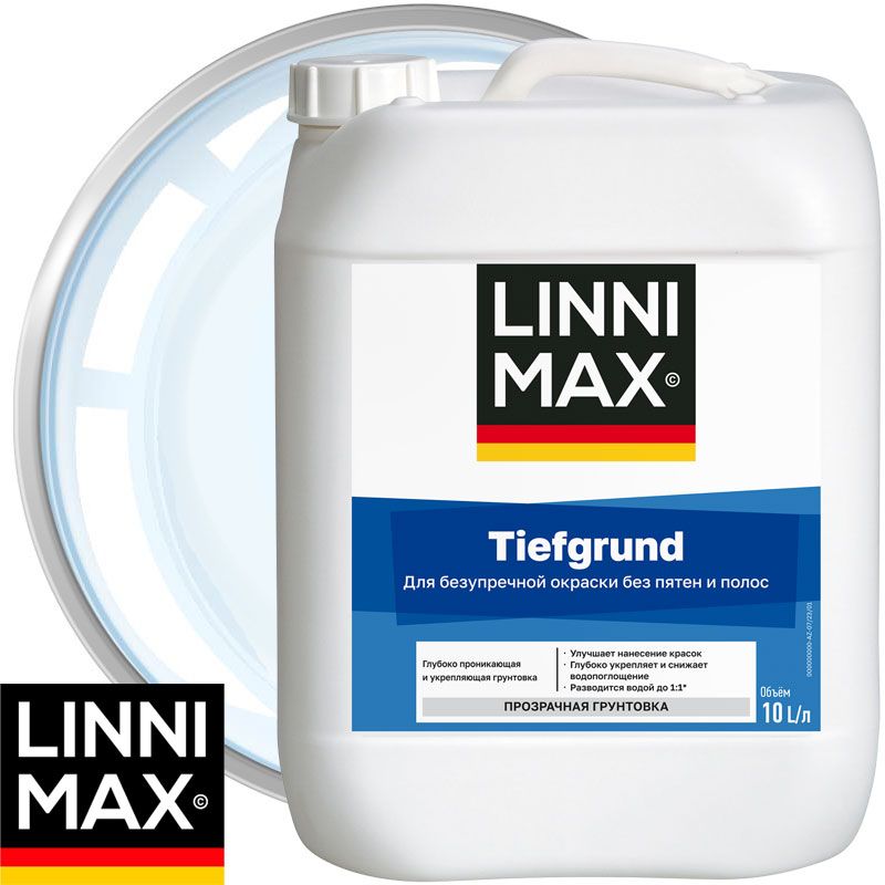 ЛИННИМАКС ТИФГРУНТ – грунт глубокого проникновения. Основа – акриловая. Пигмента не содержит. Тип работ – внешние и внутренние. Грунтуются стены и фасад. Основания: бетон, штукатурка, кладка каменная и кирпичная, гипсовые плиты, шпаклевка и лепнина.