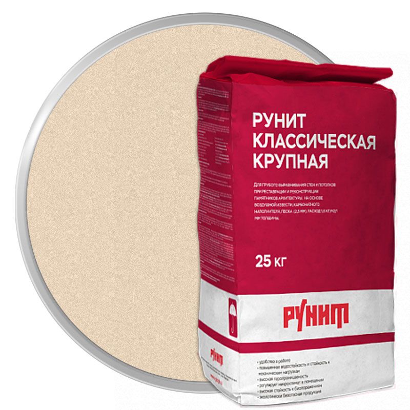 Рунит Классическая крупная – это сухая штукатурная смесь с крупным зерном (до 2,5 мм), созданная на основе воздушной извести и карбонатного наполнителя с добавлением фракционированного песка.