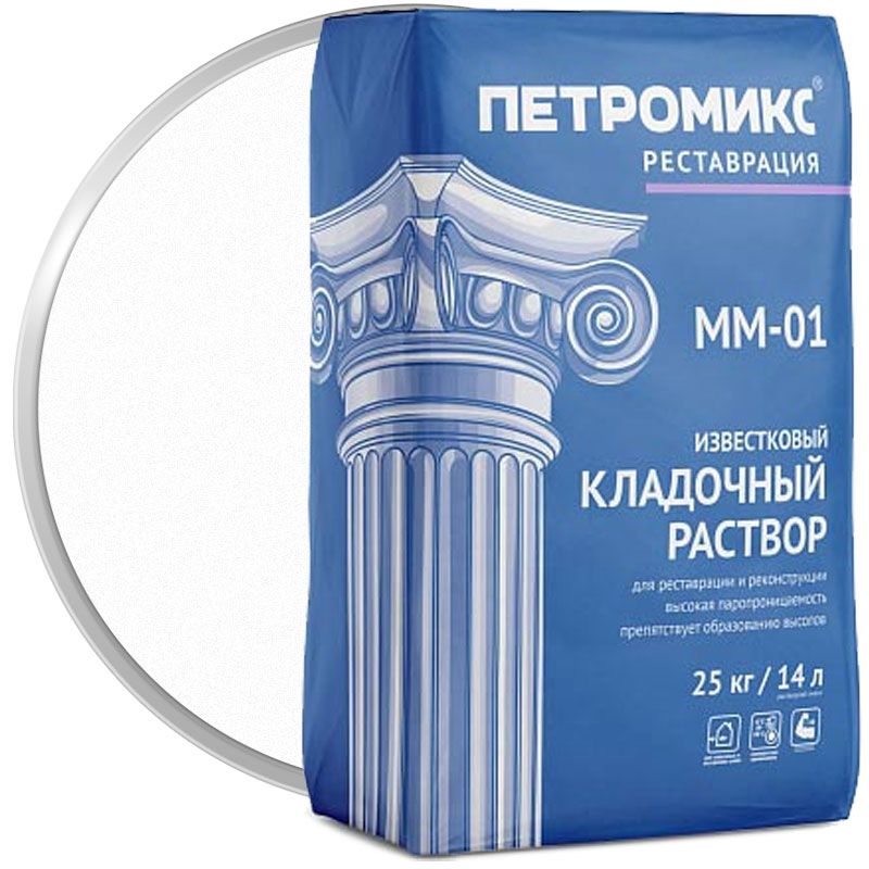 MM-01 — кладочный известковый раствор. Применяется при реставрации и реконструкции памятников архитектуры. Подходит для исторической кладки из натурального камня, силикатного и керамического кирпича.