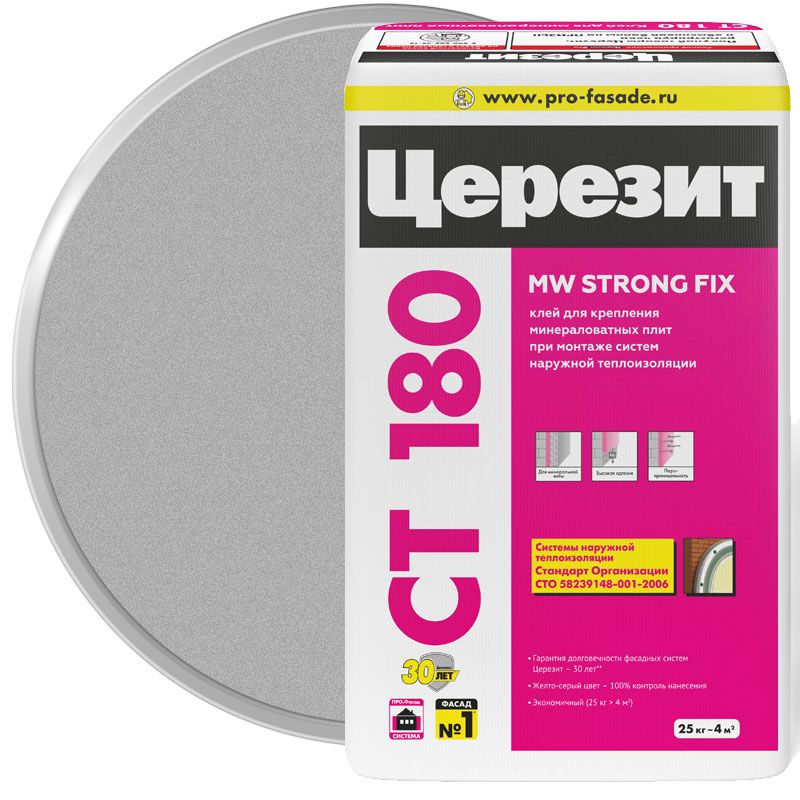 ЦЕРЕЗИТ CT 180 - клей для приклеивания минеральной ваты на фасад, при устройстве системы теплоизоляции фасада. Температура применения - от 0°C.