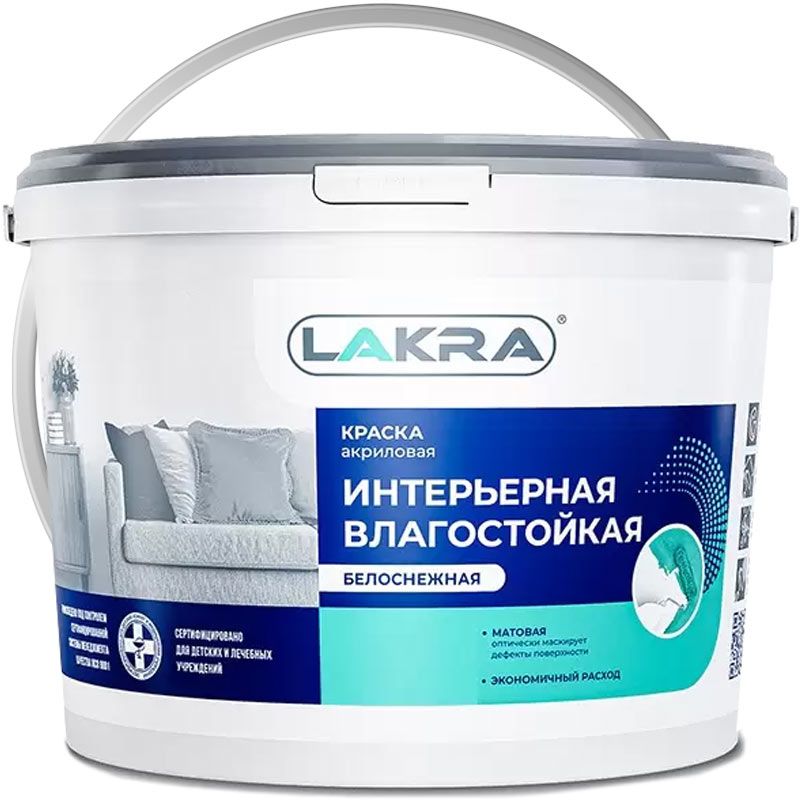 ЛАКРА Влагостойкая Белоснежная — акриловая интерьерная Краска для сухих помещений с умеренной проходимостью. Для коридора, столовой, гостиной.