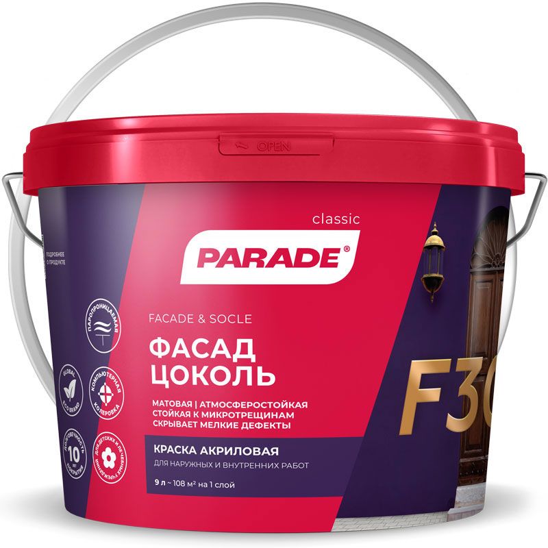 PARADE CLASSIC F30 Фасад & Цоколь – фасадная краска на акриловой основе. Окрашиваются площади, подверженные воздействию влажности и брызг – цоколь и фасад. Возможна окраска дерева в условиях помещений.