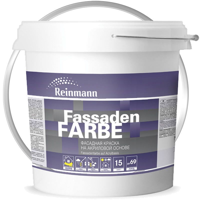 Рейнман ФасаденФарбе – краска для фасадов высокого качества на акриловой основе. Краска с высокой паропроницаемостью, укрывистая, с высокой адгезией. Степень блеска – матовая, маскирует мелкие дефекты поверхности. После окраски покрытие прочное, допускается частая влажная уборка. Основания: бетон, штукатурка, кирпич и др. минеральные поверхности.