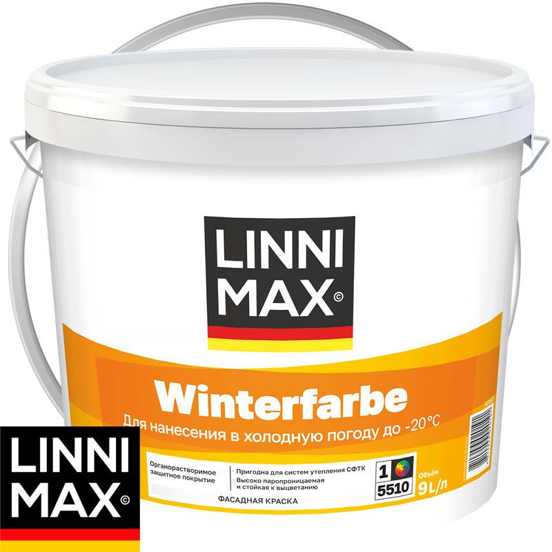 ЛИННИМАКС ВИНТЕРФАРБЕ – фасадная органорастворимая краска для применения в зимнее время. Температура нанесения до - 20 °С. Окрашиваются фасады и СФТК с утеплителем из минеральной ваты.