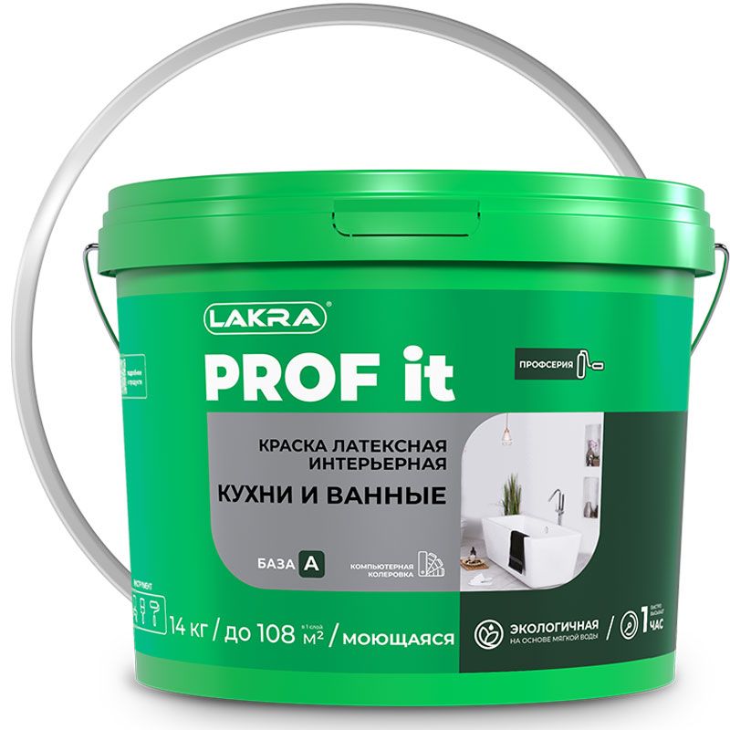 ЛАКРА PROF IT Кухни и Ванные — латексная краска для помещений с умеренными нагрузками. Окрашиваются стены и потолки. Покрытие устойчивое к влажному истиранию, окрашенные площади можно мыть. Степень блеска – матовая. Краска паропроницаемая, укрывистая, экономичная с хорошим сцеплением. Разрешена окраска в учреждениях здравоохранения и детских.