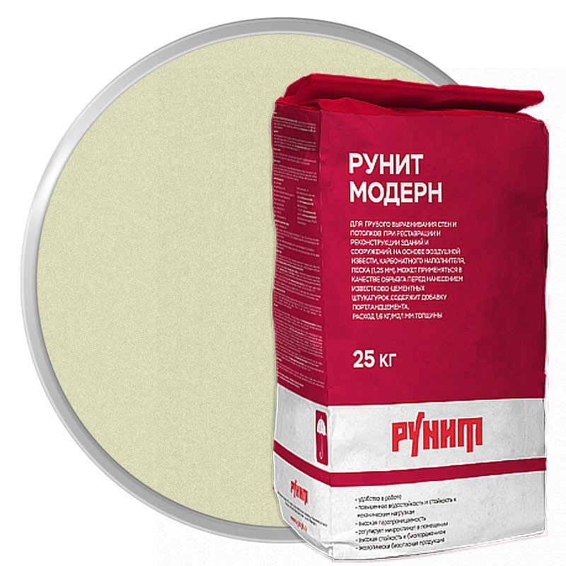 Рунит Модерн – это сухая крупнозернистая штукатурная смесь на основе гидравлической извести, карбонатного наполнителя, фракционированного песка (до 2,5 мм) и комплекса функциональных добавок. Такой состав обеспечивает более быстрый набор прочности и высокую устойчивость к атмосферным воздействиям.
