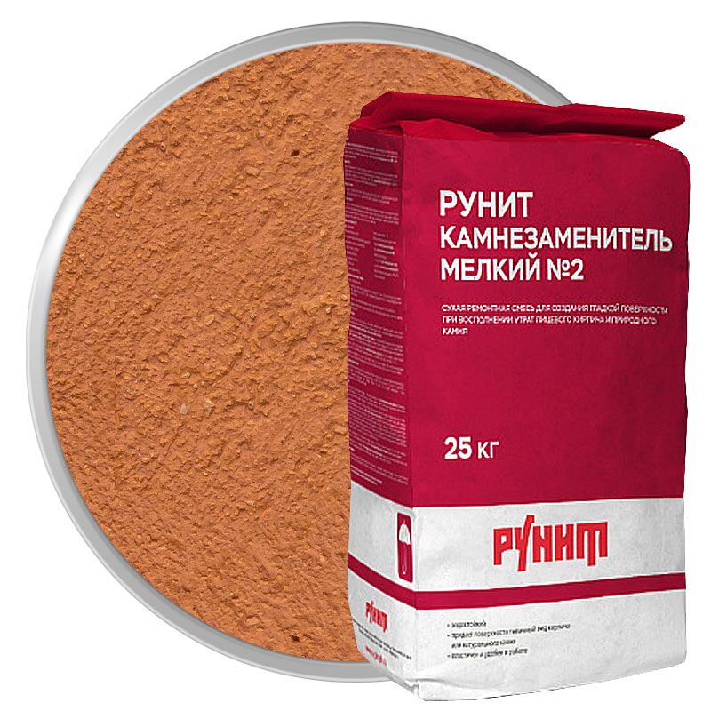Ремонтно-реставрационная сухая смесь для восполнения утрат (зоны локальной деструкции, отверстия, сколы) лицевого кирпича и природного камня, а также для создания гладкой поверхности. При создании гладкой поверхности при восполнении утрат глубиной до 10 мм может применяться самостоятельно. Для восполнения более крупных утрат смесь необходимо применять с «Рунит Камнезаменитель крупный».