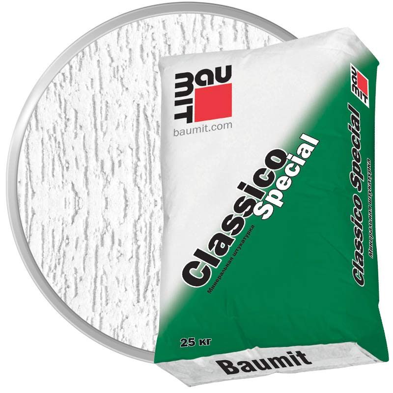 Баумит Классико Спешиал - минеральная декоративная тонкослойная штукатурка на цементном вяжущем. Продукт белого цвета. Завод выпускает штукатурку с двумя разными фактурами. Одна «Короед», другая - «Шуба». «Короед» - поверхность, напоминающая дерево, изъеденное ходами жука-короеда, а «Шуба» - равномерное зернистое покрытие. В состав входят мраморная мука, пигменты, добавки, цемент белого цвета.