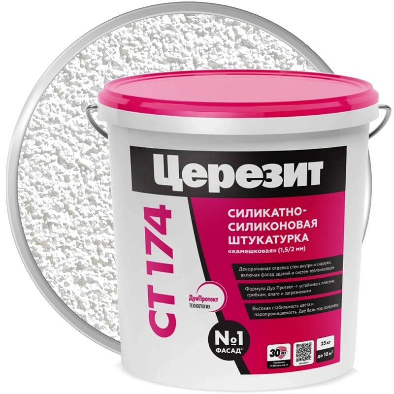 Церезит СТ 174 – это силикатно-силиконовая декоративная штукатурка, устойчивая к загрязнению, ультрафиолету, грибку и погодным явлениям. Фактура – зернистая.
