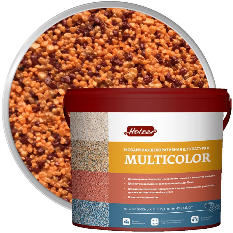 Хольцер Мультиколор Ф - мозаичная акриловая декоративная штукатурка, предназначенная для формирования тонкослойных покрытий с выразительной мозаичной фактурой. Продукт полностью готов к нанесению. В составе цветная мраморная и кварцевая крошка в разных сочетаниях. Разные сочетания, дают разные цвета и иллюзию натурального природного камня.