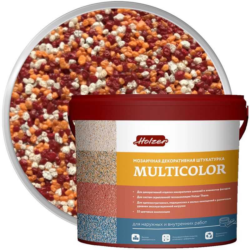 Хольцер Мультиколор Ф - мозаичная акриловая декоративная штукатурка, предназначенная для формирования тонкослойных покрытий с выразительной мозаичной фактурой. Продукт полностью готов к нанесению. В составе цветная мраморная и кварцевая крошка в разных сочетаниях. Разные сочетания, дают разные цвета и иллюзию натурального природного камня.