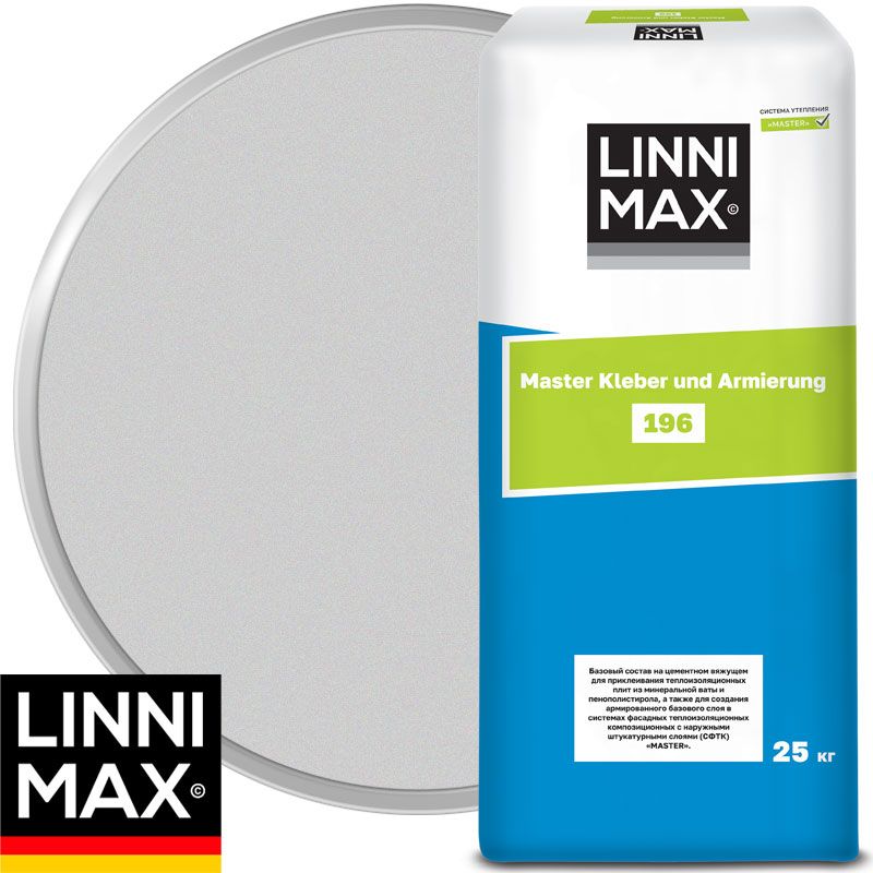 ЛИННИМАКС 196 МАСТЕР КЛЕБЕР УНД АРМИРУНГ - клеевой и армирующий состав на основе цемента. В составе кальциевые и кальцитовые наполнители в идеальных пропорциях. Компоненты делают материал гидрофобным т.е. отталкивающим воду.