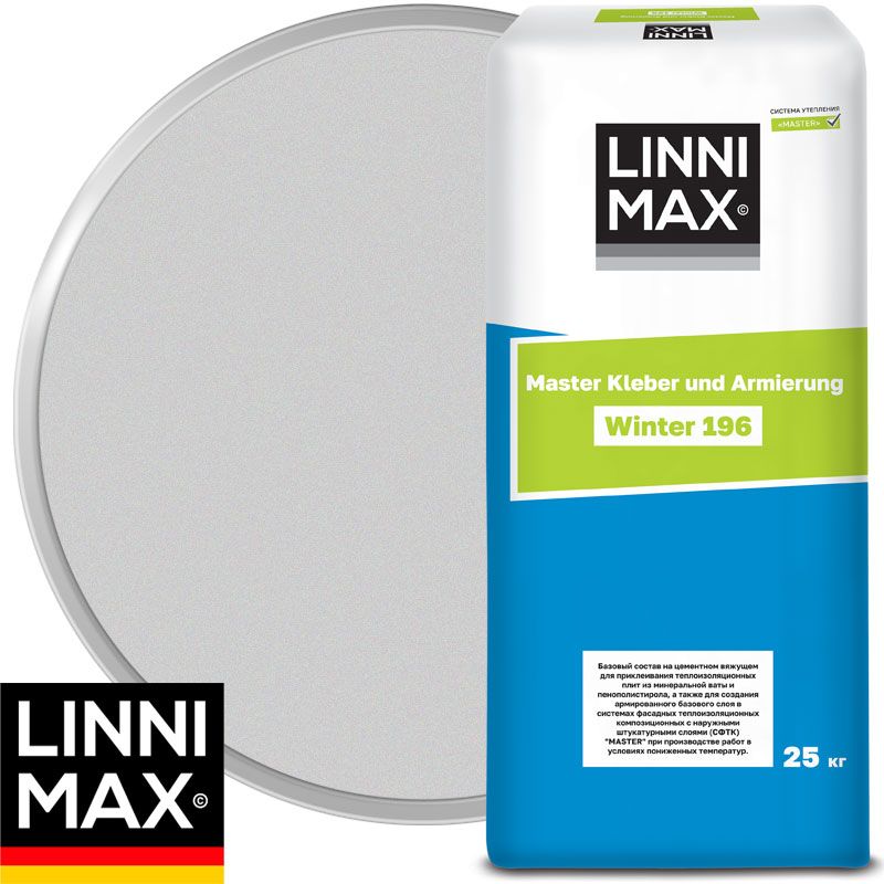ЛИННИМАКС 196 МАСТЕР КЛЕБЕР УНД АРМИРУНГ WINTER – Зимний клеевой и армирующий состав на основе цемента для работы в зимнее время. В составе кальциевые и кальцитовые наполнители в идеальных пропорциях. Компоненты делают материал гидрофобным т.е. отталкивающим воду.