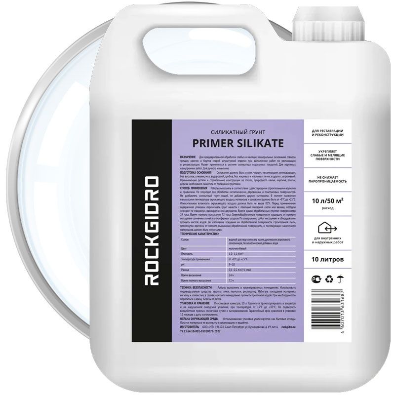 ROCKGIDRO PRIMER SILIKATE – грунт для обработки слабых мелящих оснований, а также бортов, кромок и трещин штукатурки перед реставрацией. Может применяться в системе силикатных окрасочных покрытий. В составе силикат калия. Грунтовка укрепляет поверхность основания, не нарушая паропроницаемость.